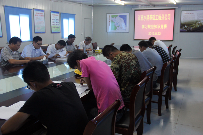 為響應(yīng)省水利廳關(guān)于《加強質(zhì)量強水建設(shè)的指導(dǎo)意見》的通知精神,迎接公司開展2013年“質(zhì)量月”活動,達到全員自覺參與質(zhì)量管理、提高工程質(zhì)量管理水平的目的,基礎(chǔ)工程分公司5~8月份組織開展了“學(xué)習(xí)規(guī)范”知識競賽活動。根據(jù)工程分散、人員不能相對集中的情況,基礎(chǔ)工程分公司通過發(fā)動宣傳、組織學(xué)習(xí)、分片考試等形式,組織人員學(xué)習(xí)質(zhì)量管理知識,檢驗學(xué)習(xí)教育成效。目前,活動第一季——《建筑樁基技術(shù)規(guī)范》(JGJ94-2008)知識競賽于