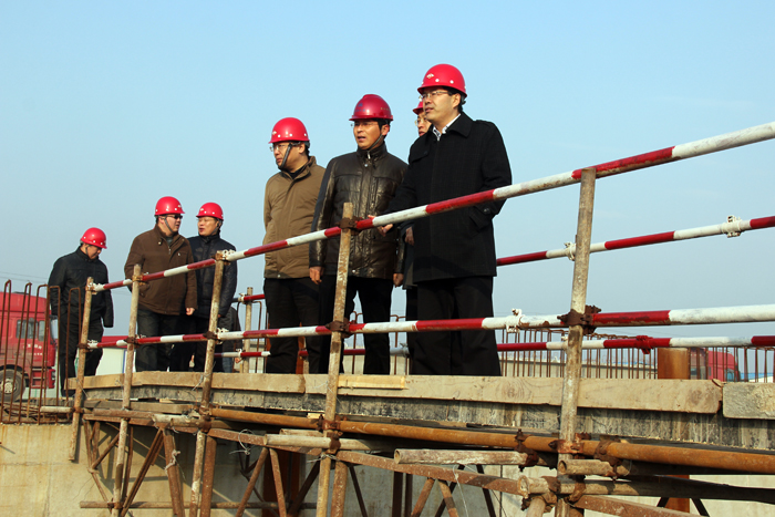 朱海生局長(zhǎng)一行先后察看了上下游閘首,又登上閘室臨時(shí)便道,察看工程施工全貌,隨后通過(guò)便道下到閘室,仔細(xì)察看了閘室底板施工,詳細(xì)施工組織情況。朱海生充分肯定了二線船閘目前的施工質(zhì)量、安全及進(jìn)度,要求各參建單位再接再厲,繼續(xù)抓好下一階段的各項(xiàng)建設(shè)工作,特別是施工、監(jiān)理單位要爭(zhēng)當(dāng)全省水利工程建設(shè)的排頭兵,嚴(yán)把質(zhì)量、安全關(guān)。同時(shí)他叮囑大家,春節(jié)即將來(lái)臨,要安排好節(jié)日期間的各項(xiàng)工作。