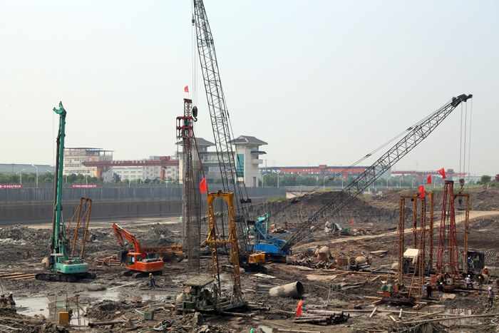 8月4日,公司在七浦塘拓浚整治工程江邊樞紐泵站工程項(xiàng)目部召開了安全生產(chǎn)及工期推進(jìn)會。公司董事長夏國春、總經(jīng)理時(shí)愛祥、副總經(jīng)理?xiàng)畋?、工程部、基礎(chǔ)分公司、機(jī)電安裝分公司、水機(jī)有限公司負(fù)責(zé)同志參加了會議。公司總經(jīng)理時(shí)愛祥主持會議,項(xiàng)目部陳興奎匯報(bào)了工程進(jìn)展情況及面臨的困難。大家就圍繞如何加快基礎(chǔ)施工進(jìn)度,保證8月20日實(shí)現(xiàn)泵站第一塊底板具備澆筑條件展開了討論?;A(chǔ)分公司經(jīng)理李桂明表態(tài),在現(xiàn)有兩臺旋挖機(jī)、一臺履帶吊、一臺汽車吊的基礎(chǔ)上,再增加一臺履帶吊,回旋鉆樁機(jī)增加到9臺。同時(shí)增加管理人員和作業(yè)工人,合理調(diào)度、組織各機(jī)械協(xié)同作業(yè),確保每天能夠完成8根灌注樁,全力以赴完成樁基施工任務(wù)。項(xiàng)目經(jīng)理?xiàng)畋蟊硎?,將帶領(lǐng)項(xiàng)目部員工發(fā)揚(yáng)能打硬仗、能啃硬骨頭的精神,增加鋼筋作業(yè)人員,增加人力、物力投入,加快鋼筋籠制作速度,確保實(shí)現(xiàn)第一塊底板澆筑的節(jié)點(diǎn)目標(biāo)。