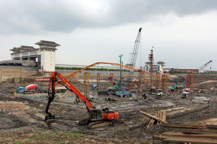 沒有熱情洋溢的動(dòng)員,也沒有信誓旦旦的表態(tài),項(xiàng)目部全體員工立即行動(dòng)起來。他們倒排工期,一個(gè)節(jié)點(diǎn)一個(gè)節(jié)點(diǎn)的去攻克。第一個(gè)節(jié)點(diǎn)目標(biāo)是在9月初完成泵站1#站身底板施工。圍繞這個(gè)節(jié)點(diǎn),項(xiàng)目部要迅速完成2000多米鋼板樁支護(hù)、7000多方灌注樁、4000多米攪拌樁的施工。樁基施工完成后,還有