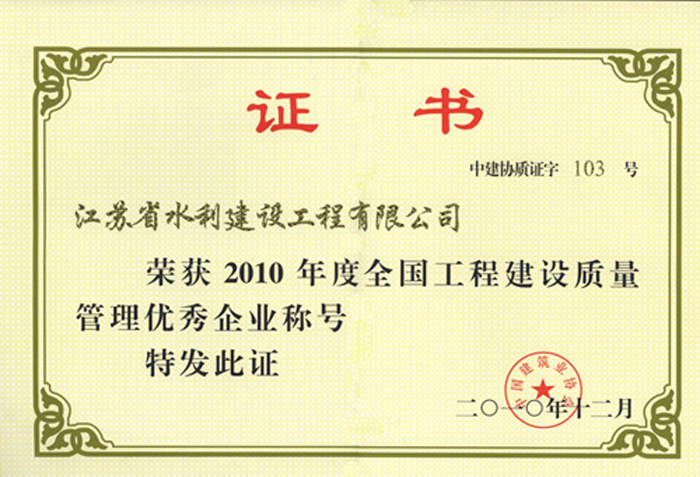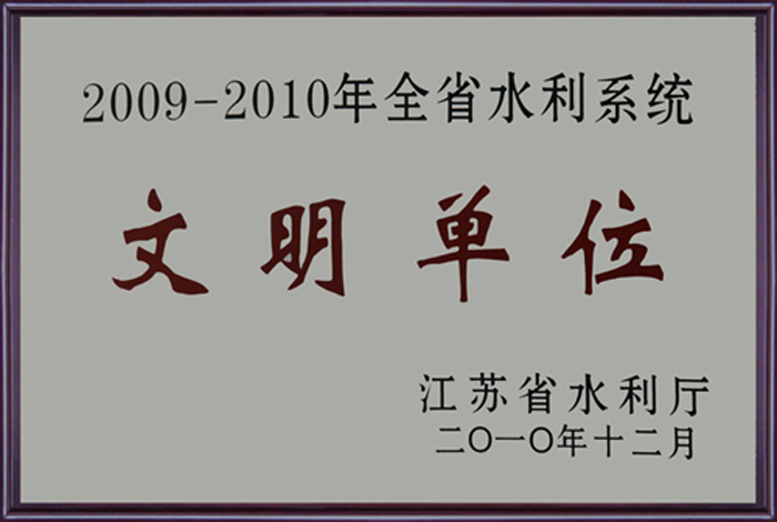 公司連續(xù)多年被評為全國水利建設(shè)先進集體、全國優(yōu)秀水利企業(yè)、全國安全生產(chǎn)和質(zhì)量管理先進單位、江蘇省文明單位、建筑業(yè)百強企業(yè),榮獲江蘇省“五一勞動獎?wù)?rdquo;。