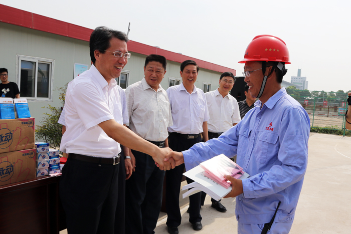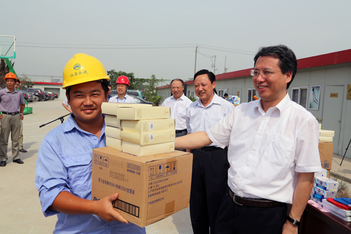 韓全林一行深入一線工地,親切看望和慰問了工地建設(shè)者,將礦泉水、毛巾、防暑降溫用品和《勞動保護(hù)手冊》、安全宣傳教育光盤等慰問品送到建設(shè)管理者手中,他還詳細(xì)詢問了他們的生產(chǎn)、生活情況,并勉勵大家要鼓足干勁,爭取又快又好地完成引江河二期工程建設(shè)任務(wù)。