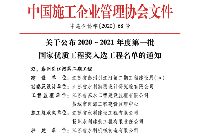 2020-2021年度第一批國家優(yōu)質(zhì)工程獎