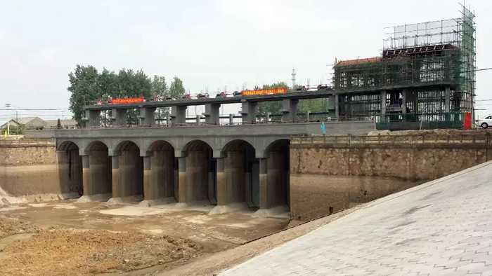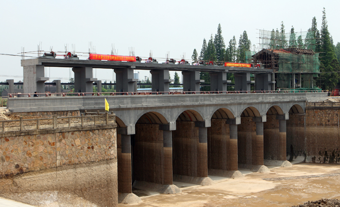 宜陵北閘位于江都宜陵鎮(zhèn)北三陽河與新通揚運河的交匯處,是里下河地區(qū)引排主要控制建筑物。主要功能為向里下河水網(wǎng)供水,排澇,攔截三陽河來草,減輕江都東閘清污機的撈草壓力。該閘建于1975年,設(shè)計流量300m3/s,共7孔。20075月省水利廳組織的安全鑒定結(jié)論認(rèn)為:該閘建成運行30余年,現(xiàn)狀存在工程結(jié)構(gòu)老化,底板、閘墩、工作橋排架強度不滿足抗震要求,公路橋設(shè)計標(biāo)準(zhǔn)低、砼閘門裂縫漏水、電氣設(shè)備老化、管理設(shè)施陳舊等問題。為消除工程安全隱患,確保工程運行,對宜陵北閘進行除險加固。本次加固改造施工主要對底板及閘墩加固、胸墻拆建、增設(shè)撐梁、工作門門槽改造、公路橋拆建、工作便橋整修、工作橋及排架拆建、混凝土防碳化處理、上下游護坡整修、增設(shè)三陽河側(cè)攔污設(shè)施、起吊排架更換閘門啟閉機、新增檢修閘門、門槽埋件更新改造、活動門擋更換、攔污柵改建、新作支擋結(jié)構(gòu)埋件;橋頭堡拆除,新建橋頭堡基礎(chǔ)等。