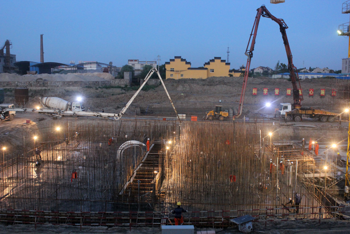 5月20日,經(jīng)過連續(xù)15小時施工,新溝河遙觀南樞紐工程順利完成了泵站底板混凝土澆筑,標志著工程施工進入了全面實施階段。