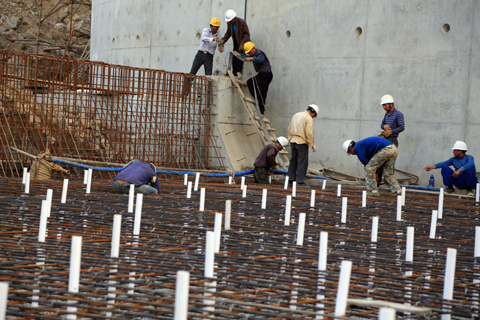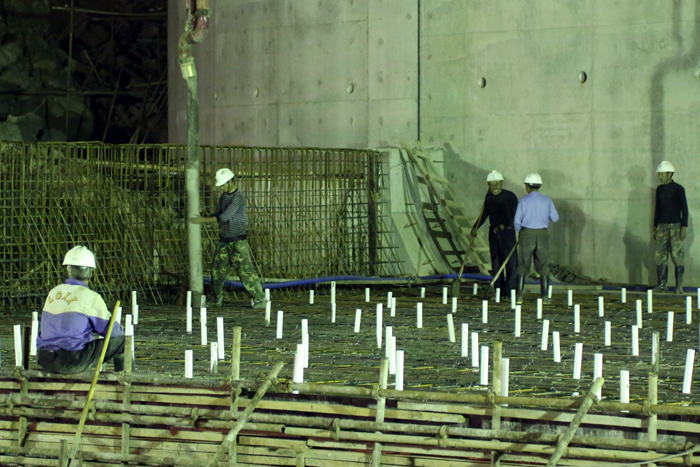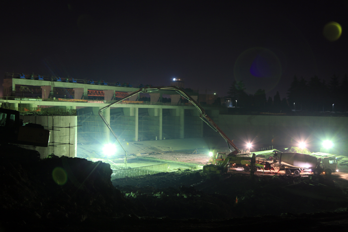 “下一步我們將集中精力完成最后一塊消力池澆筑,翼墻墻后回填土填筑,補齊上下游護坡護底,以及加緊進行閘門、啟閉機和小水電電機安裝調(diào)試,預(yù)計到5月20日可基本完成全部水下工程,為提前實現(xiàn)通水驗收目標創(chuàng)造有利條件?!表椖拷?jīng)理李新海告訴記者。記者注意到,李經(jīng)理黝黑的臉龐上充滿著自信的笑容。而在項目總工周海銀心里更有一筆帳:“泗陽閘工程從正式開工到現(xiàn)在,3個多月時間,拆掉一座老閘,新建了一座7孔(孔寬10m)的節(jié)制閘和兩孔小水電,完成砼近30000方。高峰期投入近500號人,模板近20000平方米,鋼管900余噸,扣件10多萬只。人員和周轉(zhuǎn)材料的投入是類似正常工程的兩倍以上。近一個多月來,工作面全面打開后,每天都是兩臺以上泵車在澆筑混凝土,連續(xù)有上百個小時的澆筑強度?!背R?guī)的投入保證了搶工的需要,但大量的人力物力帶來的是工程更周密的計劃、更繁瑣的安排、更嚴格的考核。項目部兩天一次生產(chǎn)會,主要管理人員每天至少一次碰頭會,一切都按計劃有條不紊的進行。所有人員都按照計劃按時按點的堅守崗位,只能提前,不能落下,特殊部位調(diào)整時必須把時間再搶回來。