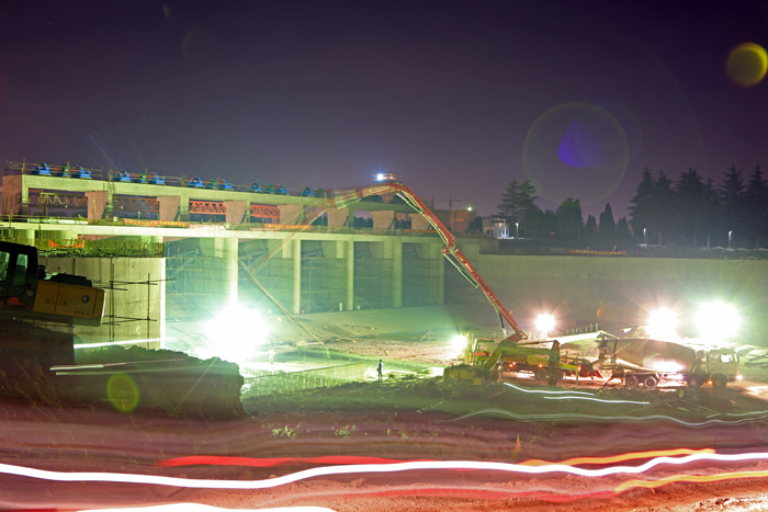 科學(xué)的施工調(diào)度管理,果斷的現(xiàn)場決策,使現(xiàn)場多點(diǎn)作業(yè)同步施工,交叉繁忙而井然有序。敬業(yè)的管理隊(duì)伍、熟練的技術(shù)工人,保證了施工效率,實(shí)現(xiàn)了“人、機(jī)、料、法、環(huán)”等各個要素的有機(jī)融合。施工高峰階段,每天保持兩臺以上泵車澆筑混凝土,連續(xù)有上百個小時的澆筑強(qiáng)度。在混凝土200多次開倉澆筑中,幾乎沒有一次是上午進(jìn)行的,一般都是白天立模晚上澆筑,通宵完成,決不會拖到第二天。以南二聯(lián)孔(6~7號孔)施工過程為例: