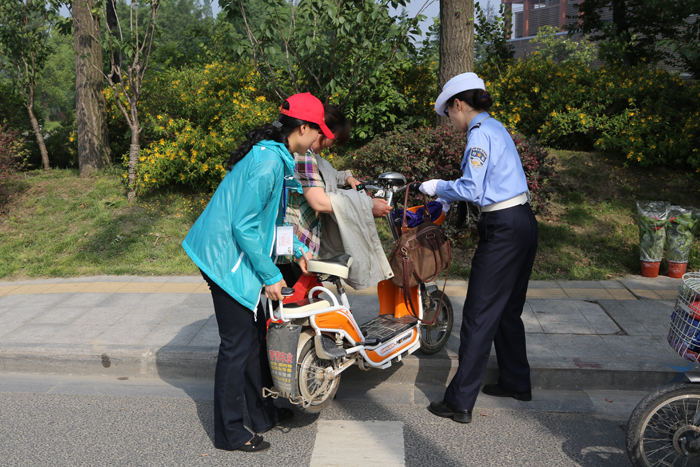 “您好,這是人行道,請下車推行,謝謝您的配合。”一面小紅旗,一頂小紅帽,公司的一名志愿者正在勸導市民遵守交通規(guī)則,安全文明行車。這是公司開展文明交通勸導志愿者實踐活動中的一個生動畫面。